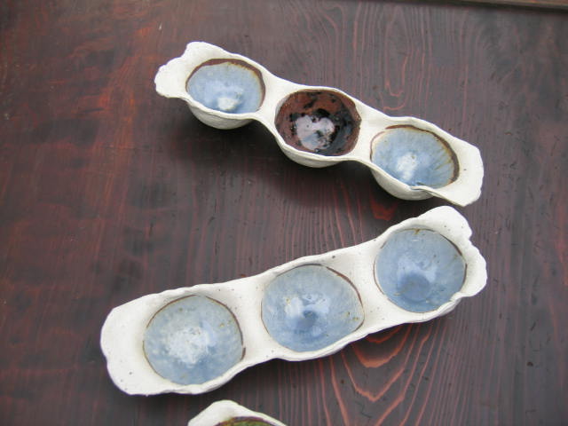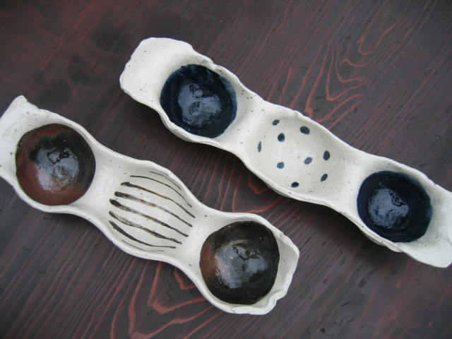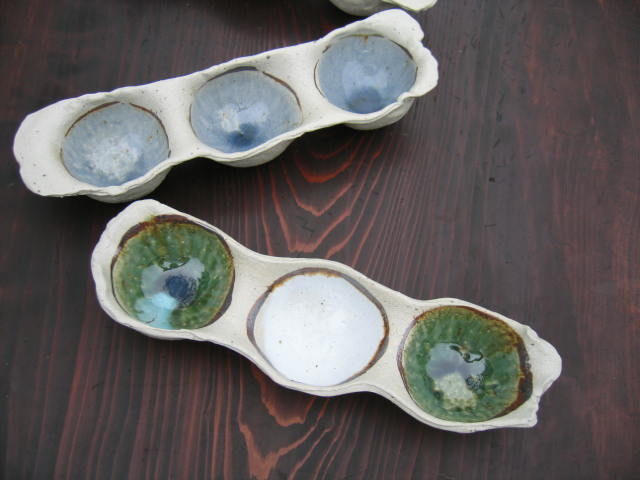 何種類かのえだ豆入れ、良いですねぇ。モノクロの幾何学模様は新しいシンプルさを感じます。ニューバージョンのは涼しげで夏にぴったりです。お客様と御自分の為の創作って温かい心使いですね。柔らかいうちから土に溶け込んでお客様の手に渡るんでしょうね。