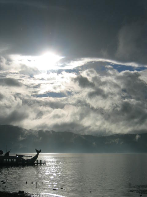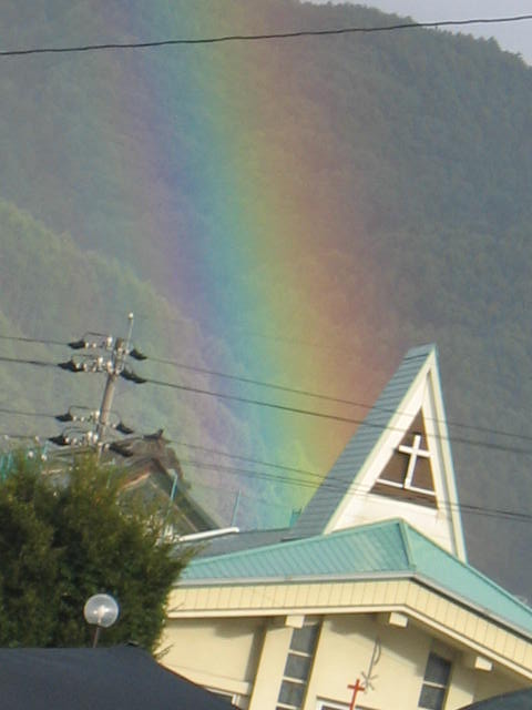 片付けのころ日が射してきて虹が。三角屋根は教会だそうです。