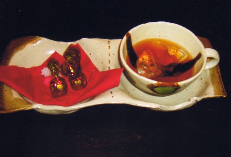 美和のふたご鉢に飲み物とお菓子を乗せています。