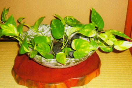 こちらは石川進の波楕円鉢に植物(ポトスでしょうか?)を飾っています。葉っぱと鉢の緑が合ってますネ。