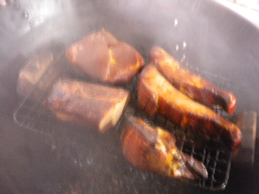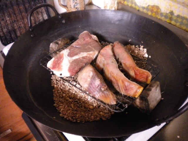 塩とスパイスで味付けした豚肉と鮭、塩抜きをしてから干しておきます。