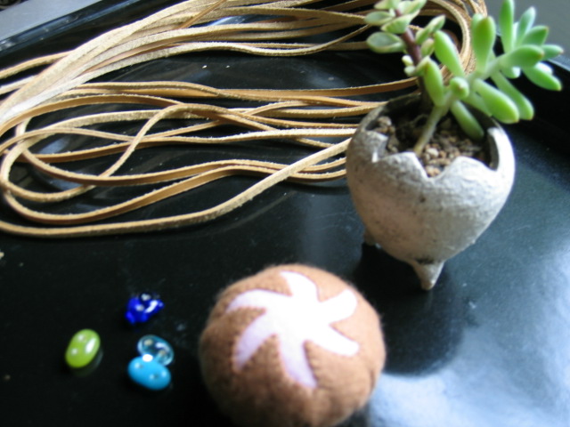 イフさんの多肉ちゃん、アプラウドさんのフェルトのイチゴメロンパン(だったと思います)、ガラス作家、伊藤さんのガラスのボタン、皮ひも。