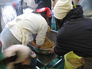 大豆と麹をよく混ぜ、機械ですりつぶします。