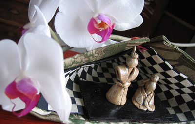 石川進の器にも飾ってみました。(蘭はすずひろさん)