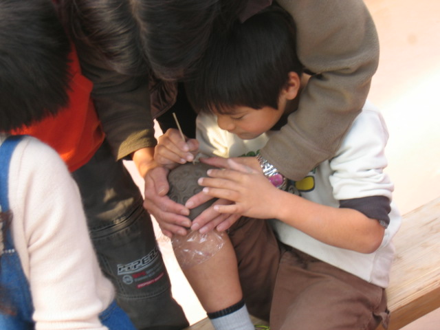 「ひじ」と「ひざ」をつかっての小皿作りは、親子の素敵なふれあいを感じました。